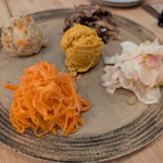 スターターにおすすめなのは、野菜だけのシンプルなサラダ。山梨の「うえのはらハーブガーデン」の野菜やハーブを主役に、オイルとビネガーと塩だけで作ったドレッシングで和えた一品。「こちらの野菜は、辛みのあるものはしっかり辛くて、甘いものはしっかり甘くて味が濃いんです。だからその味をシンプルに味わってほしくて、そのままのかたちで出しています」と長島さん。