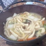メニューはなめこ、白菜、人参、かぼちゃなど季節の野菜がたっぷりと入った「不動ほうとう(1,000円)」のほか、馬刺し、いなり寿司、もつ煮、つけもの盛り合わせ、ご飯の6種類のみ。自家製麺を味噌仕立ての汁で煮込み、野菜をたっぷり入れたほうとうは、ダシの旨味も効いた香りも豊かな逸品だ。
