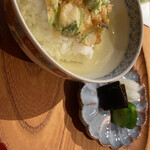 東京・神楽坂で骨董店を営む慎太郎ママの目利きで選ばれた美しく可憐な食器の数々が、楽しむ幸せを教えてくれる。美しく飾られたフグ刺身、優しい味わいのすり流し、サクサクのかき揚げをのせた小さなお茶漬け。花形に彫られた木のお盆の中に、骨董の豆皿やお椀が並んだ世界観は、思わず「かわいい!」と盛り上がる。