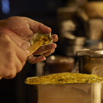 今の点心ムーブメントを肌で感じられるスタイリッシュな店。都内外資系ホテルで研鑽を積んだ2人の料理人が繰り広げる広東点心の世界は、伝統に新たな解釈を加えたクリエイティブなものだ。右側がオープンキッチン、それに向かい合うカウンター席、後ろにテーブル席。キッチンに積み上げられたセイロともくもくの蒸気が、モダンな店内で絶妙にマッチしている。