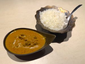 2階建てのお店は1階がカウンター、2階がテーブル席。若くておしゃれな雰囲気の3人の男性がお店を切り盛りしています。レギュラーメニューは「マトンキーマカレー」と「バターチキンカレー」。この日はスペシャルメニューとして「ポークカレー」もあり、それぞれあいがけも可能ということだったので、「マトンキーマとポークのあいがけ」1,200円をオーダーしました。