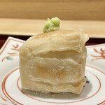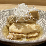 最初の品は、本店でも人気の「焼き胡麻豆腐」。白胡麻をすり、葛粉、出汁を火にかけてよく練って2日ほど冷やし固めた胡麻豆腐に、片栗粉をまぶして焼いている。アツアツの状態で提供され、外はかりっと香ばしく、なかはとろとろ。上品な胡麻の香りがたまらない。