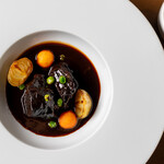 が、しかし。ここでは、スープのベースとして用いるのは、水ではなく、2日間もかけて仕込むフォン・ド・ヴォー。これで仔羊肩ロース肉を煮こむのだから、「クスクスというよりも、ナヴァラン風煮込みですね」との伊藤翔シェフの言葉も頷ける。このフォン・ド・ヴォーの旨味に仔羊独特の草の風味がほのかに混ざり合い、エキゾチックな中にも品の良いコクを感じさせる。エレガントな「クスクス」だ。