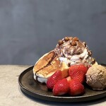ランチタイムには、ワンハンドレッド付きの看板メニュー「“名物”トリュフオムレツ ペリグーソース」(1,400円)をはじめ、季節限定の「シャインマスカットパンケーキ」(1,680円)や旬のフルーツをふんだんに使ったパフェなど、充実したラインアップ。