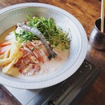 ランチタイムには、大和肉鶏の炊き込みご飯に蔵出し粕汁、または酒粕帯うどんを組み合わせたランチセット(800円~)も楽しめる。