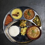 メインとも締めとも言えるダルバートは、3種が揃う中から好みを2種選ぶシステム。それにダルスープやアチャール5種、タルカリ(野菜の炒め煮)にザーグ(青菜の炒めもの)等々がついてなかなか豪華。