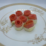 「黒」が定番で、ココアのクッキー生地に中はカスタードクリーム。「ピンク」はイチゴ風味のクッキー生地で、中はチョコレートクリームです。「茶色」は、ほうじ茶の生地に栗あん。「黄色」は、今日はかぼちゃあんですね。季節によってカレーの場合もありますね。それぞれ、目も違うのがわかりますか?