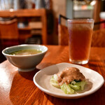 雑居ビルの階段を上って2階へ。扉を開ければ店内はリゾート感漂う雰囲気。ディナータイムは1ドリンク制でお通しが付きます。個人的な話ですが僕は一人ではあまりお酒を飲まないので、ソフトドリンクを頼んでも本来お酒のアテに合うお通しが付いてくるというのはあまりうれしいと思うことがありません。しかし、ここのお通しは心の底からうれしいのです。えびせん、サンバル、ピクルスがついてきて300円ですよ。破格!