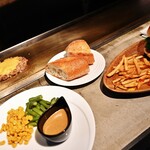 地下1階の「The Grill」は15時までランチタイム、17時からバルタイム。ランチのシステムがユニークです。まず1階の「Butcher」で食べたい肉を選び、それを下へ持って行くと、炭火で表面を軽く炙ってくれます。あとは各席の前にある鉄板で各自焼いて食べるという趣向。平日は「ハンバーグ」「肩ロース」のステーキが、週末は「サーロイン」「リブロース」などが人気です。