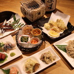 本日の海の幸は「しまあじ」「ホタルイカ」「ウルメイワシ」。そんな3種と共に運ばれてきたのは、炭火のミニコンロ。セルフで炙りを楽しむユニークなおもてなし。卓上で自分好みの具合に焼き上げる。