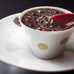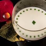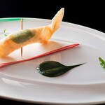 真っ白なカリフラワーのクリームに映える緑色のドットにアートを感じる、ロブションを代表する一皿「オマ-ル海老のジュレ なめらかなカリフラワーのクレ-ムで」は、芸術性はそのままに、テイクアウト仕様に変身。