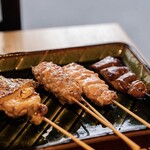 左から胸、赤身、軍鶏つくね、せせり、 うずらの卵など。せせりとは首肉のことで、しこしことしたテクスチャーが人気の串だ。このせせりと胸が塩で、ほかはタレ。だが、そのタレも甘さはグッと控えめ。ジュワッと滲み出る肉汁をしっかり受け止め、塩とはまた一味違う旨味が舌に広がる。