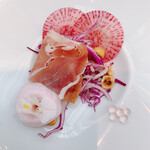 フォアグラテリーヌをもなかでサンドした「フォアグラと林檎をサンドした黒もなか スモークの香りを纏わせて」、野菜がたっぷり入った「三河鶏とビーツのスープ サワークリームとういきょうの香り」など、まるでアート作品のような料理が並ぶ。
