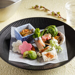 「季節の八寸コース」(6,000円)は、旬の素材をふんだんに使った9種類の料理を盛り合わせた八寸をはじめ、名物の味噌とチーズの冷製茶わん蒸し、鮮魚のお造り、発酵デザートが味わえる。18時までの来店でワンドリンクが付くうれしいサービスも。