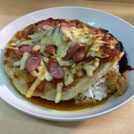1周年記念の限定メニューもとんでもない個性的なものでした。「ソーセージピザハードコア」1,300円は、カレーの上にソーセージピザがそのままのるというもの。しかしこのピザ、生地はカレーに合わせるパンの一種である「パロタ」であり、ピザソースにもカレーで使うスパイスを使用してあり、カレーとの相性が意外にも良いのです。