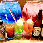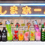 また、名物ドリンクの位置づけが、“映えなシャリキン”。これはシャーベット状の焼酎入りグラスに、割り材の瓶を逆さに突っ込んだもの。瓶を取ると割り材がグラスに流れだし、カラフルなドリンクが完成。ネオンのきらびやかさにも負けない美しさに惹かれ、写真に撮ってSNSにアップする客も多いという。