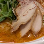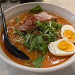 「ポタージュカレー麺」950円にスパイス追加(50円)でいただきました。ポタージュ状になったカレーと中華麺。白ネギ、青ネギ、刻み海苔、鶏チャーシューと味玉という構成です。しっかり混ぜ合わせて食べれば間違いなくおいしいドライカレー麺とでも言いましょうか。