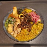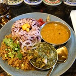 「Curryプレート」980円にトッピングを全部つけていただきました。トッピングは「味玉」100円、「パクチー増量」100円、「ヨーグルト&キトゥルハニー」100円と、すべて100円なのが分かりやすいです。ヨーグルトはトッピングというよりデザート的な形でした。