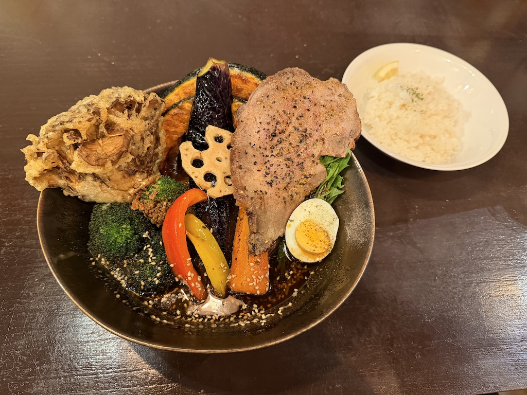 さらにはそばにもスパイスカレー的な副菜がのっていて、これがまたそれぞれ手が込んでいて意味のあるものとなっていました。トッピングに「豚天」220円も付けたのですが、こちらも絶妙な揚げ具合。そして天ぷらにもスパイスが振りかけられ、これだけで食べてもおいしく、カレーにつけて食べてもおいしいものでした。