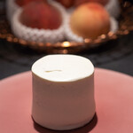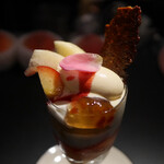 季節の一皿なので今だけのデザートだが、今回は少しだけ食べたい人が楽しめるアシェットデセールとして考案したという。クレームダンジュの上にカットしたイチゴと桜あん、さらにイチゴのアイスとスライスした冷凍イチゴがふんだんにかかった一品だ。店内でその日に作っているアイスを含めて、それぞれ食感や温度が異なるイチゴがたっぷりと詰まったイチゴ尽くしのデザートで、イチゴ好きにはたまらない。ひと匙ですべての要素をすくって食べれば、酸味と甘さのバランスが良いイチゴと、品の良い和の甘さの桜あん、そしてフロマージュ・ブランを使用したクレームダンジュの軽やかな食感が見事に調和している。