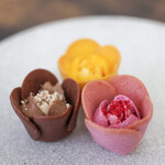 新作の1品目は、チーズのつぼみをイメージした黄色いチューリップの「スフレチーズドチューリップ」810円。カマンベールチーズの香りとクリームチーズの贅沢な口どけを掛け合わせ、舌の上で濃厚にとろけるクリーミーなスフレに仕上げた。