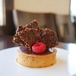 「クレメ・ダンジュ」は、フランス・アンジュ地方発祥で、フレッシュチーズに泡立てた生クリーム、メレンゲなどを加えて水気を切ったデザートで、ガーゼなどに包まれているものをよく見かけます。ベリーのソースをかけることが多いですね。こちらのものは、フロマージュブランという少し酸味のあるフレッシュチーズに、濃厚なクリーム、サワークリームを合わせた軽い食感のチーズケーキにフランボワーズのジャム、焼いたメレンゲ、生クリームなどを重ねたものになっています。爽やかなチーズケーキと甘酸っぱい杏が、素晴らしいハーモニーを奏でます。