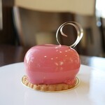 「ラルク・アン・シエル」とはフランス語で「虹」の意味です。名前の通りカラフルなケーキで、構成としては、ピスタチオのダックワーズ生地にピスタチオのマジパン、フランボワーズのバタークリーム、杏のコンフィとなっていますが、マジパンはアーモンドが香り立ち、バターのコクとフランボワーズの甘酸っぱさが渾然一体となったバタークリーム、ねっとりと旨味のある杏……。一つ一つの香りと味わいが素晴らしく、それでいて調和がとれているという、まさに一流のオーケストラの演奏を彷彿とさせるような逸品です!