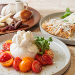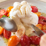 ブッラータとは、生クリームと繊維状にカットしたモッツァレラを、フレッシュなモッツァレラの生地で巾着状に包んだもの。「たっぷりトマトとブッラータ オレガノ添え」は、そんなブッラータの魅力をダイレクトに味わえる一皿。