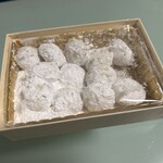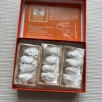 写真は、粉糖たっぷりの丸いくるみクッキー。他にも種類がいろいろあり、箱の文字やイラストも注文数によってはデザインからしてくれる。かわいいだけではなく、もちろんクッキーもおいしい! 感謝のひとことが書かれた箱に、買う方ももらう方も、なんだかほっこりするクッキーだ。