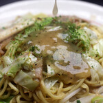 お好み焼き 貴家。「イカ天そば入り(肉・玉子・イカ天)」