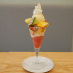 ぴしっとした端正な切り口は、食べるのがもったいない気持ちに。甘酸っぱいフルーツ、甘い生クリーム、ほんのり塩気が利いたパンのバランスが絶妙で、目利きが厳選したからこその圧倒的な味わいです。こだわりのフルーツで作ったパフェももちろんおいしいので、ぜひ食べてみてください。