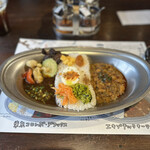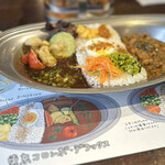 今回は全部のせ的な、東京コロンボ・デラックスにエキゾチックキーマの「あいがけ2種盛り」1,400円をいただきました。店名ともなっている東京コロンボは、カリブ海の料理であるコロンボという、肉や野菜をスパイスで煮込んだものをカレーとしてアレンジしたもの。ほかにありそうでないスタイルです。