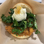 「バターミルクフライドチキンバーガー(オリジナル)」単品 500円は、シャキシャキのビネグレットキャベツサラダと、しっとりふんわりと歯切れの良いバンズとともにバターミルクチキンを楽しめる。そのほか、チキンにコルビージャックチーズやエッグタルタルをかけたバーガーといったラインアップも。