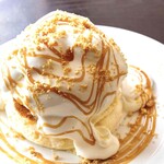 定番人気の「星(あかり)」は、バナナとキャラメルがのったメレンゲ入りパンケーキです。北海道産生クリームが覆いかぶさるようにかかっているのがたまりません。生クリームは甘すぎず、ふわふわ食感で軽く食べられます。