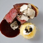 Grand Maison ORENOのスペシャリテは、ツヤのあるクラシカルな赤ワインのソースやカットした断面の美しさが魅力的な「鹿フィレ肉とフォアグラのアン・クルート グラン・メゾン風」。柔らかくシルキーな味わいの鹿のフィレ肉をベースに全部位を活用し、フォアグラと合わせてパイ生地で香ばしく包み焼き上げた一品だ。