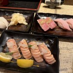 「中でもイチオシの『炙りサーモン押し寿司』は炙りサーモン、特製ソース、ハラペーニョが絶妙にシンクロして、炙り寿司の未来を感じさせる一品。僕自身、炙り寿司はほとんど食べないのですが、これだけは別格です。また、最新の急速凍結技術を使った『氷結熟成寿司』は、思わず唸ってしまう衝撃の寿司。鮮度が良い魚が旨い寿司になる、という暗黙の常識を覆し、冷凍魚でもここまで旨い寿司になるのかと考えさせられました。熟成過程を解凍に結び付けて完成された寿司に仕上げるまでの苦労は相当なもののはず。寿司の未知なる可能性を感じさせてくれる一軒ですね」