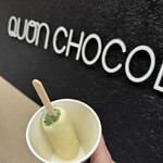 久遠チョコレートは、アイスクリームもおすすめ。「コールド・ストーン・クリーマリー」とコラボしていて、好きなアイスバーとチョコを選んでディップできるんです! 私はチョコミントのアイスバーに、ミルクチョコをチョイス。