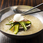 「葛冷麺」の特長はこのシャーベットスープ! 牛骨や牛テールのだしに野菜や果物のフルーティな甘みや酸味が加わった複雑な旨みがやみつきに。シャリシャリ食感が暑い夏にはたまらない。