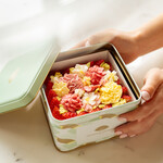 『NYチーズケーキ系のねっとりした感じです。紫と青の部分を最初に食べたら、酸味が強くて、「あれ?色によって味が違うの?」とその後はチビチビ、色ごとに食べてみました。んー、上部のツヤツヤの部分にレモン(というよりも梅?)の味がついてるのかな。色に関係なく、土台は同じ味みたい。私はNYチーズケーキ大好きなので、このこってりねっとりの粘度ありありは好きです。』(キレートれもんさん)