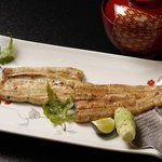 白焼きは熱々で提供。わさびをつけてそのまま食べてもよし、わさび醤油で味わうもよし。口のなかでふわっととろけておいしさが後を引く一品だ。