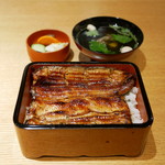 同店は、天然うなぎに勝るとも劣らない旨みと風味を持つと言われている、静岡県・大井川のブランド「共水うなぎ」も取り扱っている。「共水鰻重」(肝吸い・お新香付き)6,500円。お持ち帰りのうな重も「花」80g・2,350円から「鶴」240g・6,300円まで取り揃える。