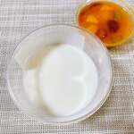 軟らかな桃の果肉の下には、爽やかな味わいのカルピス風味のソルベ、とろとろ食感の桃ゼリーと生クリーム。さらにその下には、穏やかな味わいのフランボワーズソースと食感にアクセントを加えるコーンフレーク。ちなみにパフェに飾られた白鳥は、ラングドシャという極薄焼きのクッキーの一種。