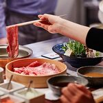 きのこは、ひら茸・たもぎ茸・山茶茸・えのき茸をたっぷりと使用。お肉は、米澤豚一番育ちや黒毛和牛を組み合わせて楽しめる。きのこの旨みが溶け込んだスープと、良質なお肉との相性は抜群だ。