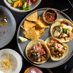 軽くつまみたい時には単品のタコスもスタンバイ。写真は中央手前が「フライドシュリンプ、紫キャベツ、胡瓜のサルサ、モリタクレマ、パクチー」(650円)、右が「パストール風チキン、アボカドサルサ、パイナップル、パクチー」(600円)、左が「カリフラワー、オリーブ、梅干し、松の実、焦がしトマトのサルサ、チャイブ」(600円)、中央奥が「スイートポテトと九条ネギ、カシューサルサ」(600円)。