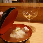 では、今回作ってくれた料理を一品ずつ見てみよう。まず、日本料理の神髄とも言える椀は、季節の「鱧松」。椀と言えば、だしへのこだわりもひとしおで、一回一回、鰹節削り器で自らが掻いた削りかつおで丁寧にだしを引く。脂ののった鱧は淡路の沼島産、松茸は亀岡産。淡い品のいいだしに、鱧の旨みが加わって、なんともふくよかで香り高い味わいの椀となる。その余韻の深さと長さはさすがだ。