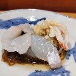次の一品は、先付や、コースの途中の箸休めとしても人気のある「くじらベーコンのぬた」で、人気の通年メニュー。今の時期は、とうもろこし、アスパラ、枝豆などと和えているが、冬場は九条ねぎを加えるなど、季節の変化を楽しませる。くじらベーコンは和歌山県産で、ほどよい塩気と脂気がどんな素材とも相性がよいので常備しているそうだ。