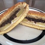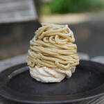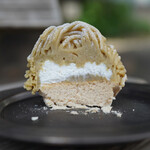 「パリブレスト」は、1891年、パリ—ブレスト間の自転車レース開催を記念して作られたお菓子です。自転車の車輪を模したドーナツ形のシュー生地に、プラリネ(ナッツ)のクリームを挟み、上にアーモンドスライスをトッピングしたものですね。こちらのお店では1人用のプチガトーに仕立て、リング状のシュー生地の中にカスタードクリームを絞り込むという凝った作りとなっていますね。プラリネのクリームが濃厚な味わいです。