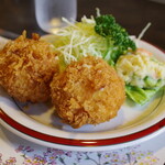 「ステーキ」や「かにクリームコロッケ」は自慢の逸品。オムライスはチキンライスを卵で巻いた「2代目」と、チキンライスの上にふわとろオムレツをかけて仕上げる「3代目」から選べます。