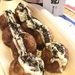 「黒七味 醤油」は僕が思いついたメニューです。いわゆるソースマヨのガツン系ではない和系たこ焼き。黒胡椒の香りを楽しみながら頬張ってください。ビールや焼酎はもちろん、ハイボールにも合います。