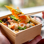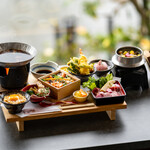 五穀豊穣の玉手箱は、完全予約制・数量限定での提供。通常価格2,000円が、10月限定で1,500円での提供となるキャンペーンも実施中だ。旬の食材を使った華やかな料理で、嵐山の美しい眺めを一層贅沢に楽しんで。